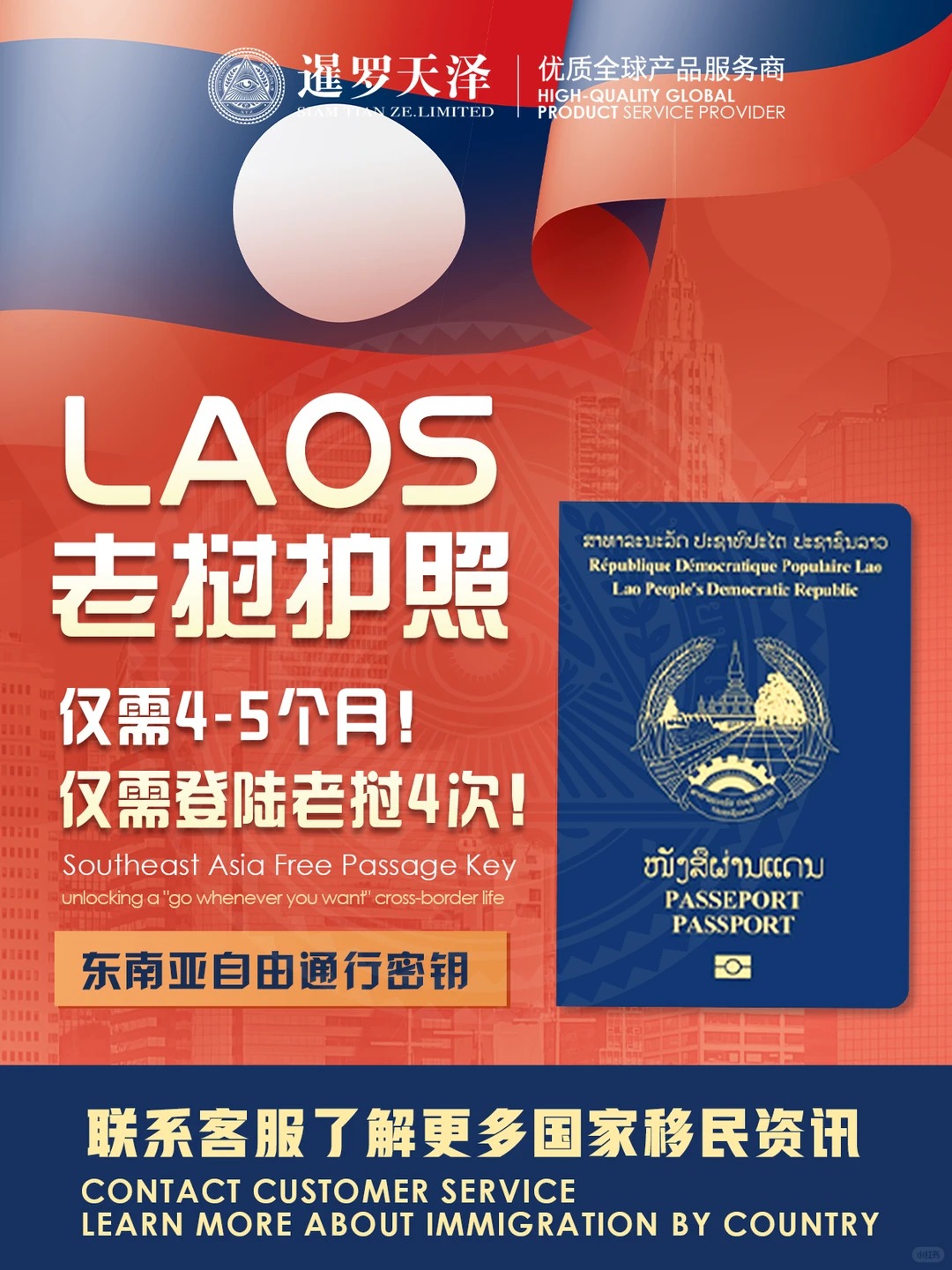 老挝护照|东南亚自由通行密钥,解锁“说走就走”的跨境生活 🧳 仅需4-5个月,即可手握老挝护照,畅行东南亚多国,轻松开启商务、旅行、居住多重可能!全程仅需登陆老挝4次,流程清晰可控,专业团队全程跟进,省心省力办妥所有手续。 老挝护照核心优势:出行、税务、门槛三重红利,解锁多元生活 1. 跨境出行超便捷:免签/落地签/电子签覆盖100+国家地区,东南亚核心目的地随心走——泰国60天、新马泰越柬等12国免签,商务出差、度假旅居说走就走。 2. 税务规划更灵活:支持公民跨境移居避税,无全球征税束缚,叠加老挝本土外资税收优惠政策,无论是跨境贸易还是资产配置,都能降低税务成本。 3. 办理门槛低易落地:无复杂资质要求,全程仅需登陆老挝4次,4-5个月即可办结,流程清晰可控,专业团队全程跟进,无需耗费过多时间精力。 4. 东盟区位红利足:作为东盟成员国,依托区域贸易协定,便于拓展东南亚商务版图,搭建跨境合作桥梁,兼顾事业发展与生活便利。